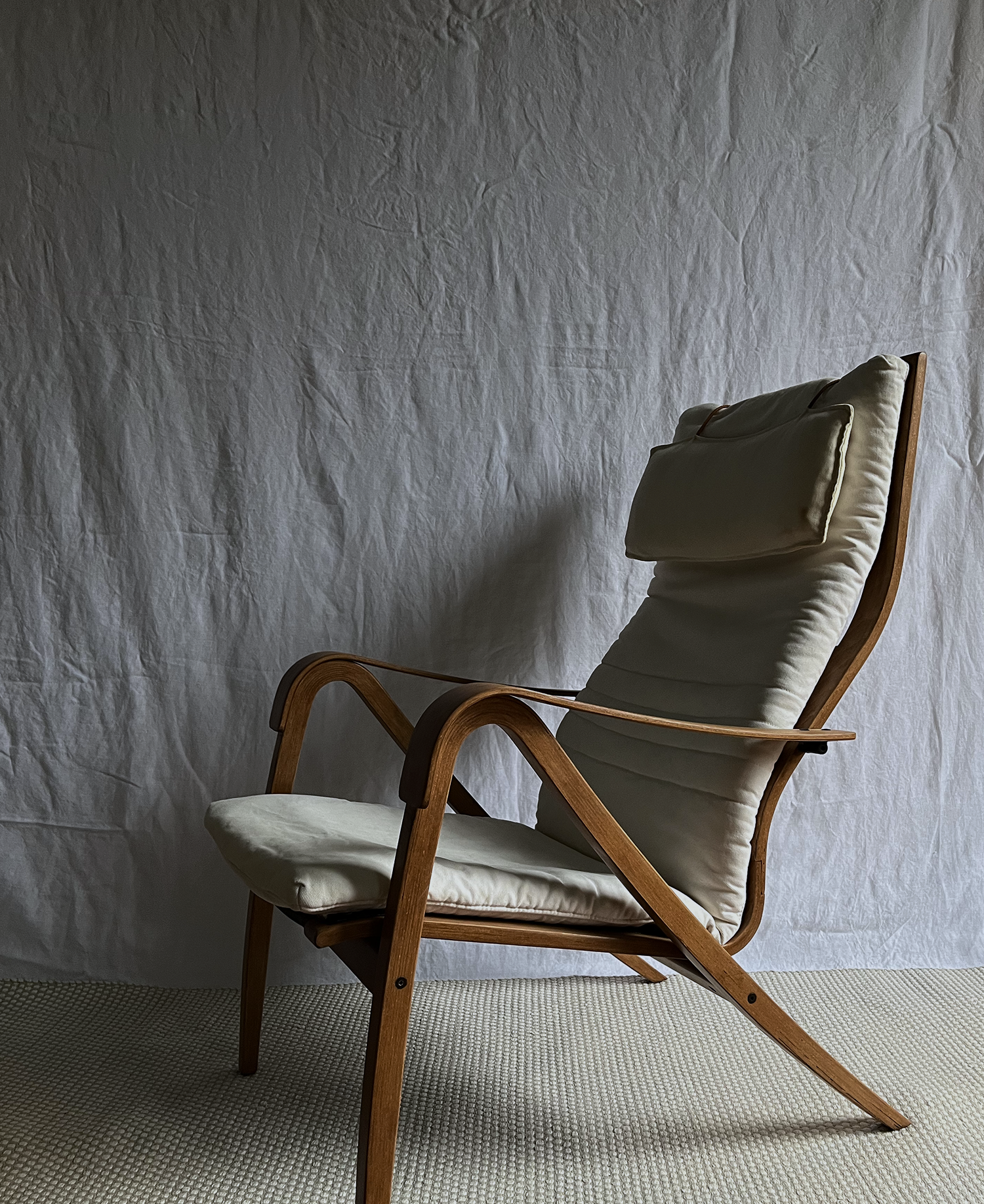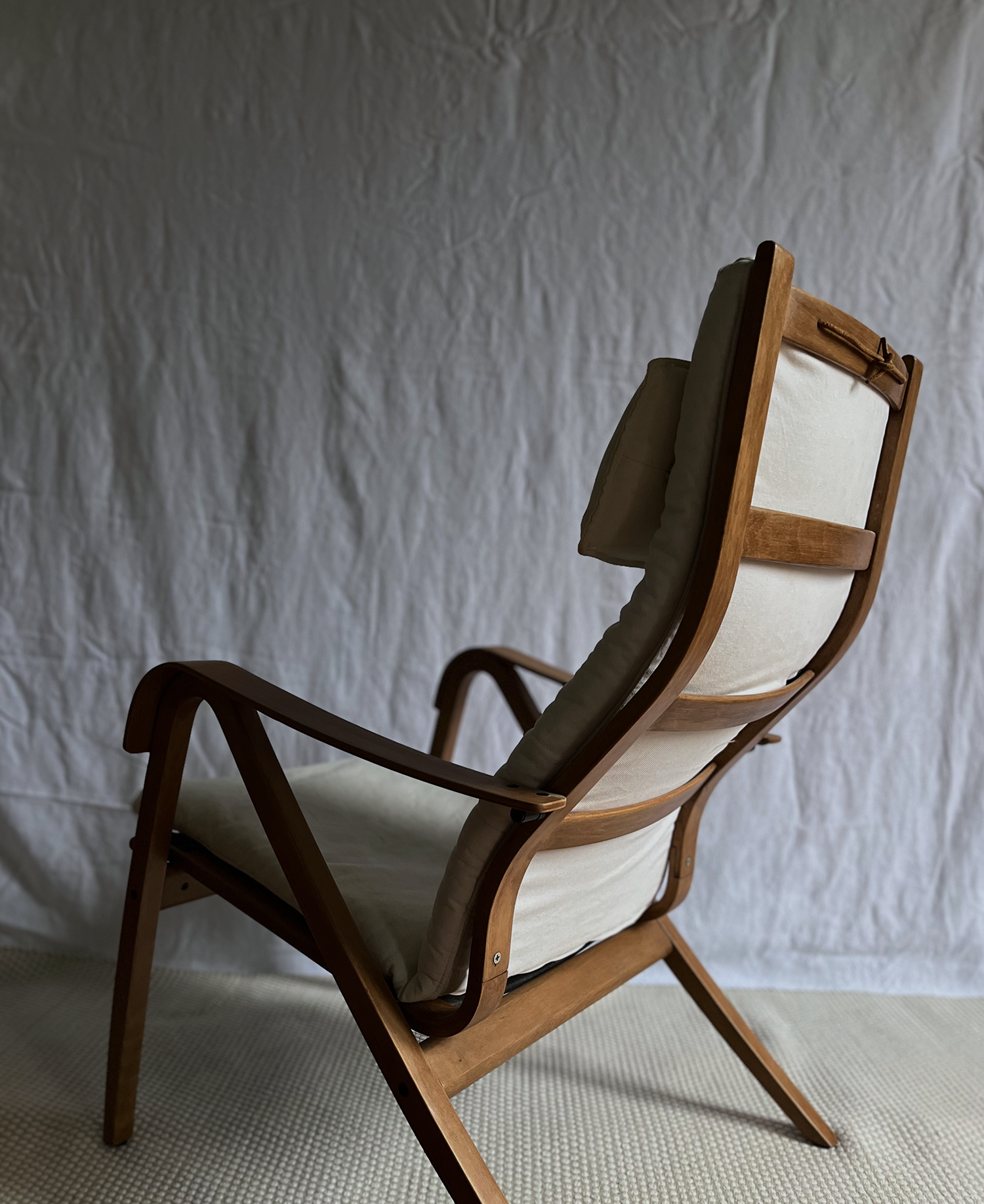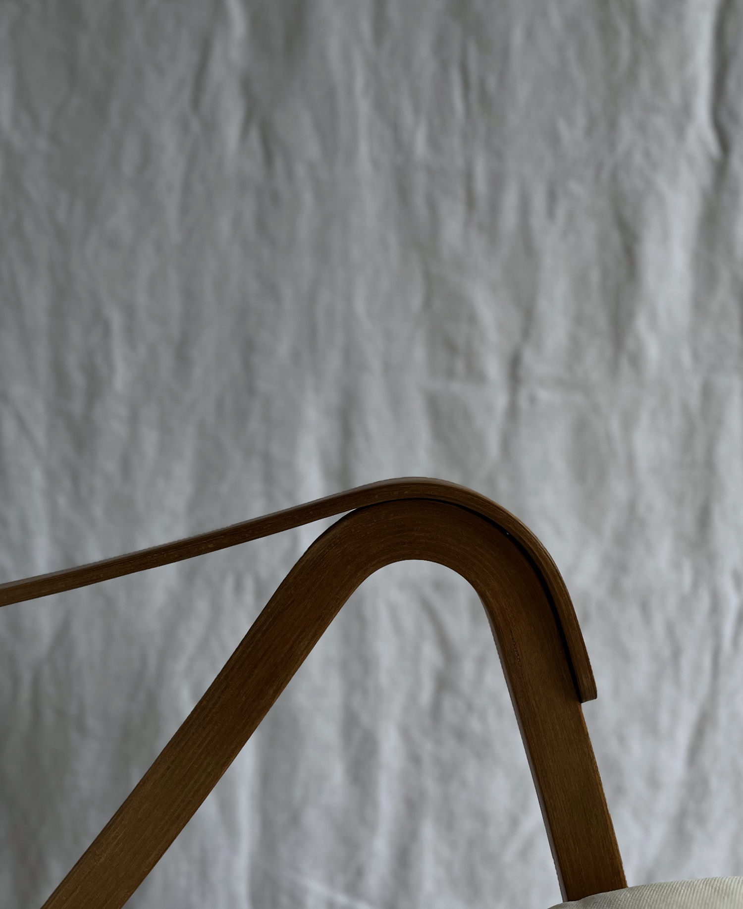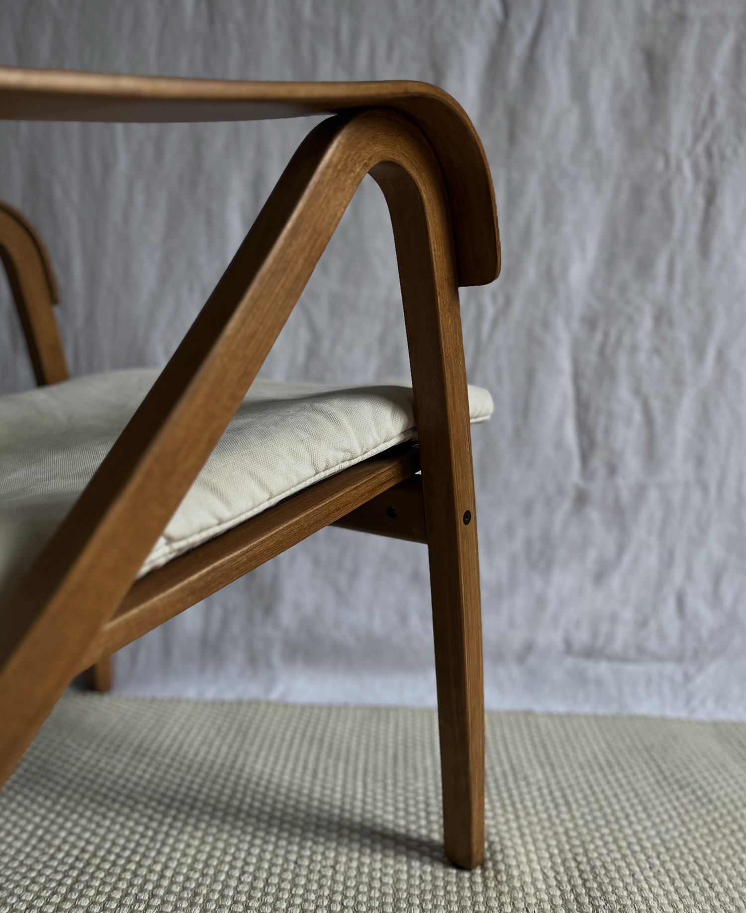 Beautifully curved, packed with attitude and elegance. Soft walnut finish. We adore the crisp lines of this versatile design. Seating cover in good vintage condition, with slight discolorations. Custom upholstery available on-demand.