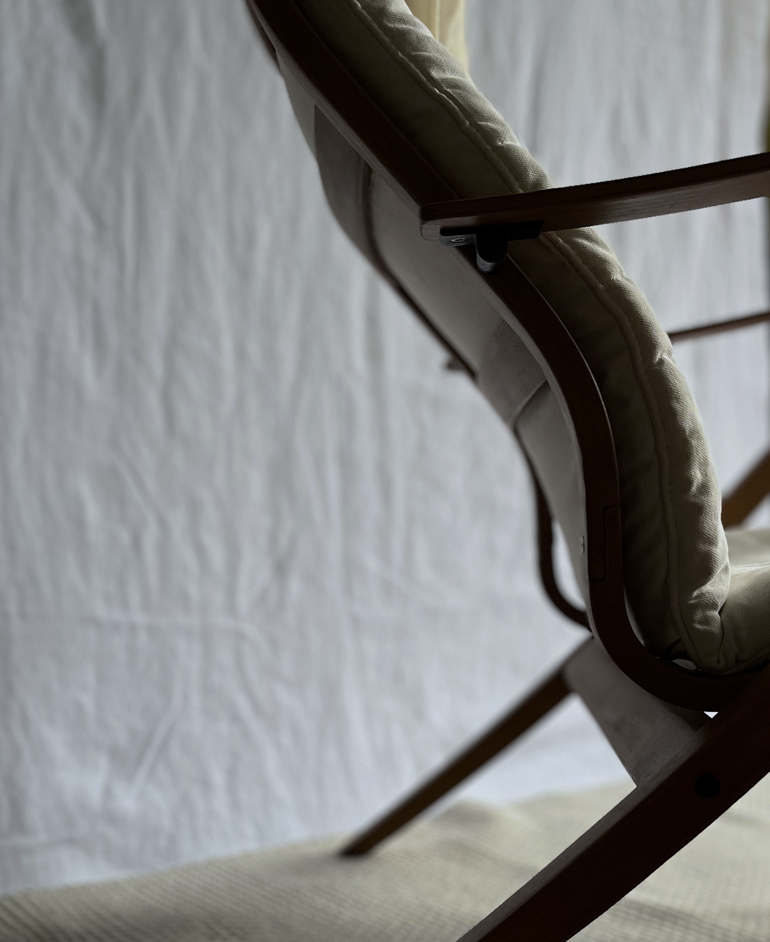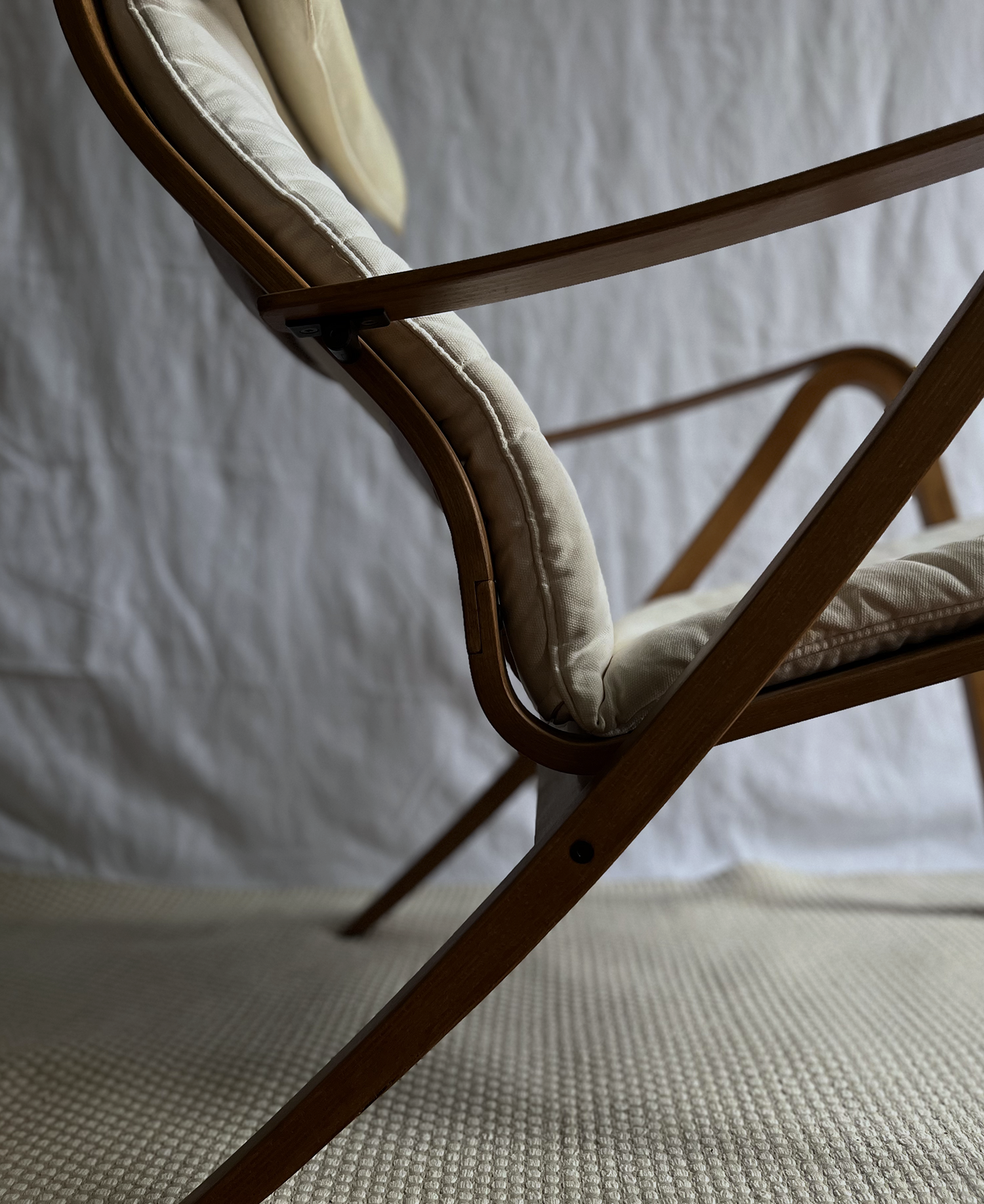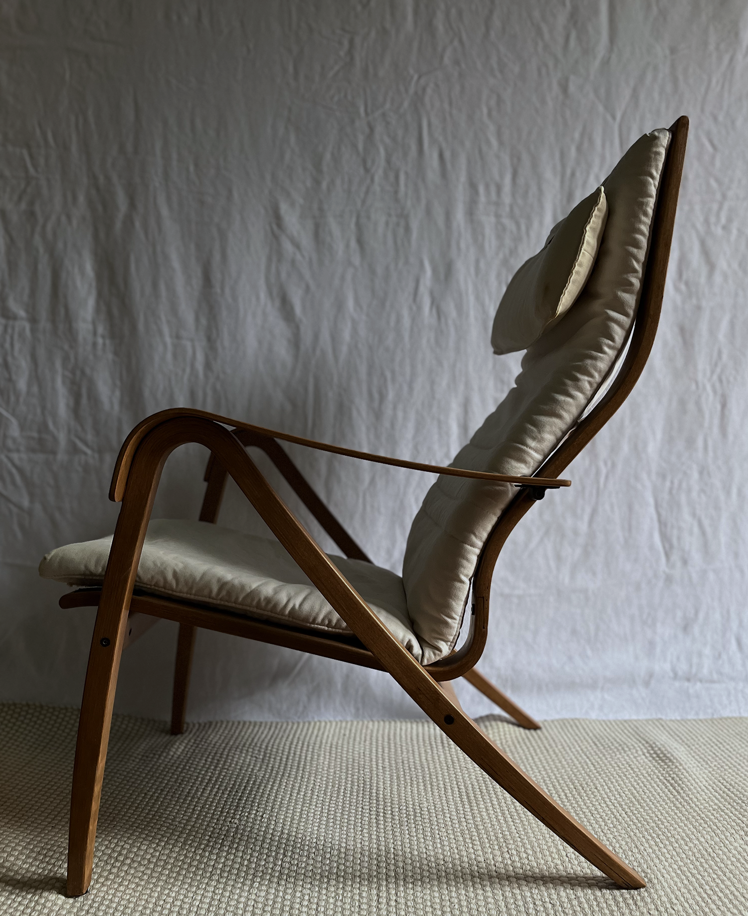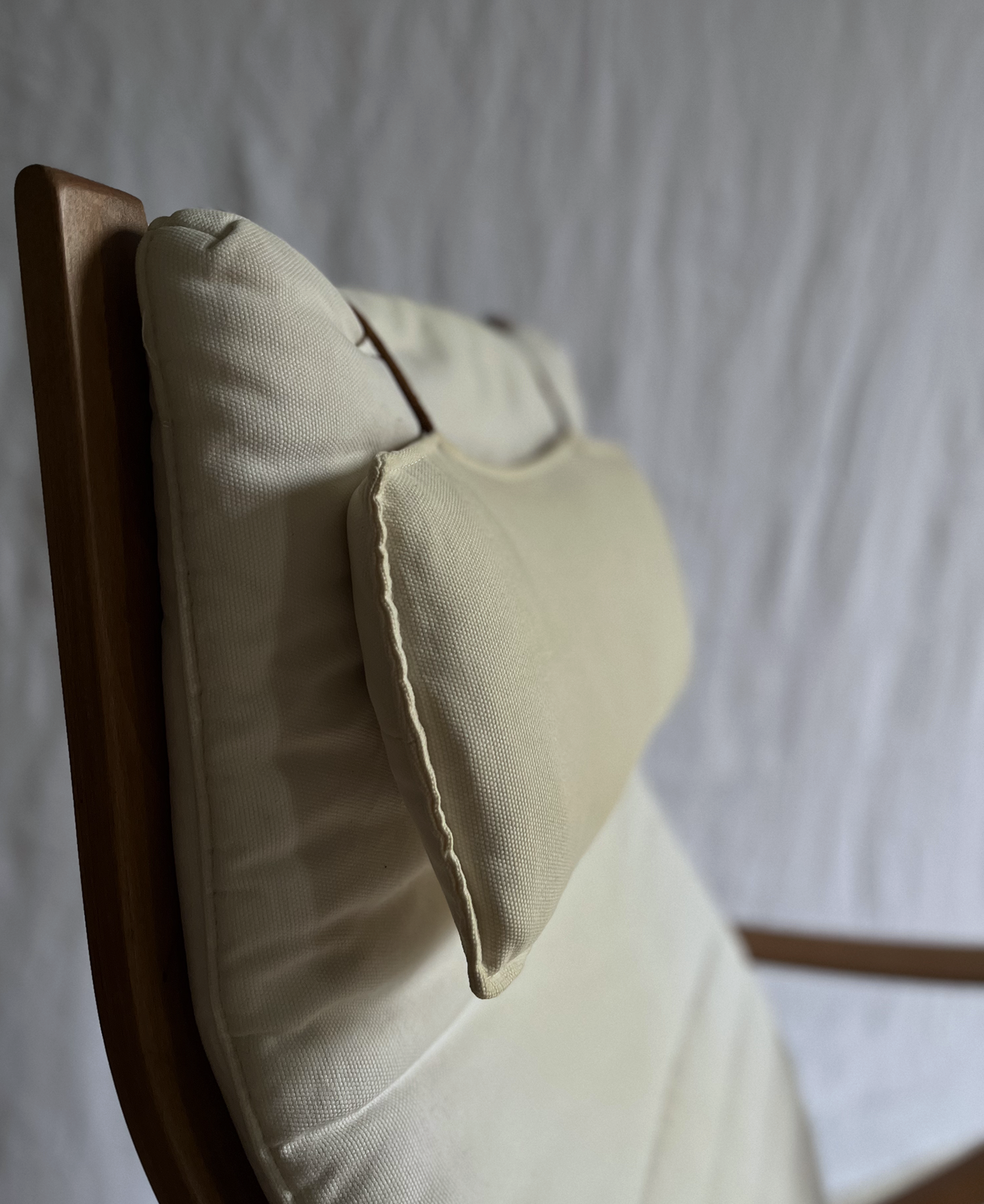 Beautifully curved, packed with attitude and elegance. Soft walnut finish. We adore the crisp lines of this versatile design. Seating cover in good vintage condition, with slight discolorations. Custom upholstery available on-demand.